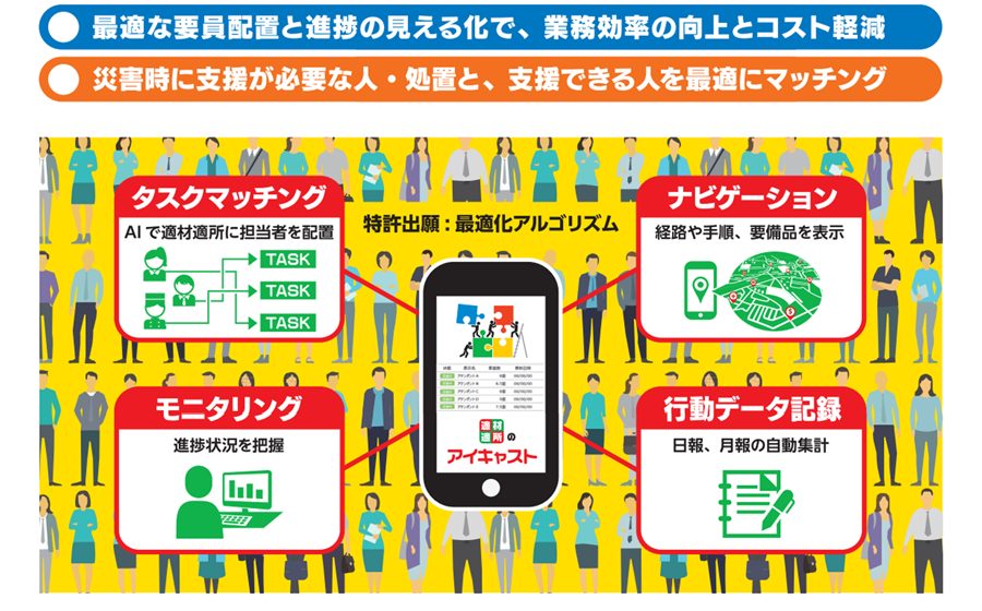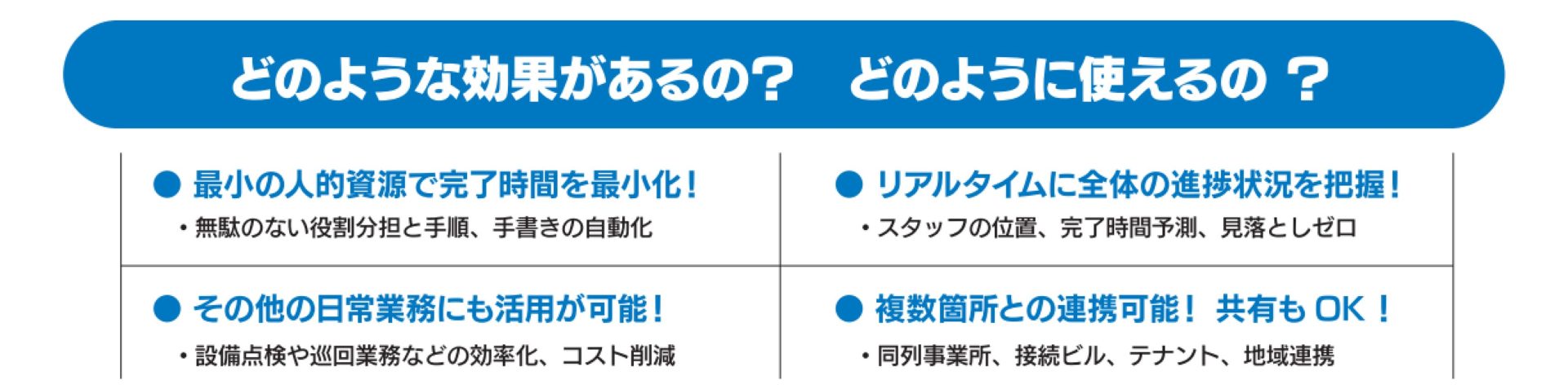 安全管理や災害時対応のように、離れた場所で複数の担当者が作業を分担して行う業務において、作業状況に応じて、各担当者に対して新たな作業内容を速やかに周知・共有することで、突発的事象への対応力や管理業務の効率性、業務の質を高めることが可能となる。ここでは、適切な要員配置と、進捗の見える化により業務効率支援アプリケーションについて紹介する。