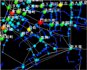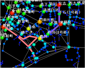 東京臨海部には新公共交通機関である東京BRT(Bus Rapid Transit)が運行されており,2030年代には地下鉄8号線(有楽町線)の豊洲・住吉間の延伸が開業予定(図1)である.このような新しい交通システムによる地域の移動利便性を時空間ネットワークを用いて評価する.ここでは,地点間の平均的な移動時間の短縮だけではなく,新路線の時刻表を仮定して現状のバスと鉄道からなる公共交通ネットワークに組み込み,運行頻度と路線間の接続を考慮にいれた各バス便鉄道便の利用度合,利用者動線の変化を考慮した忠実度の高い推定を行っている.