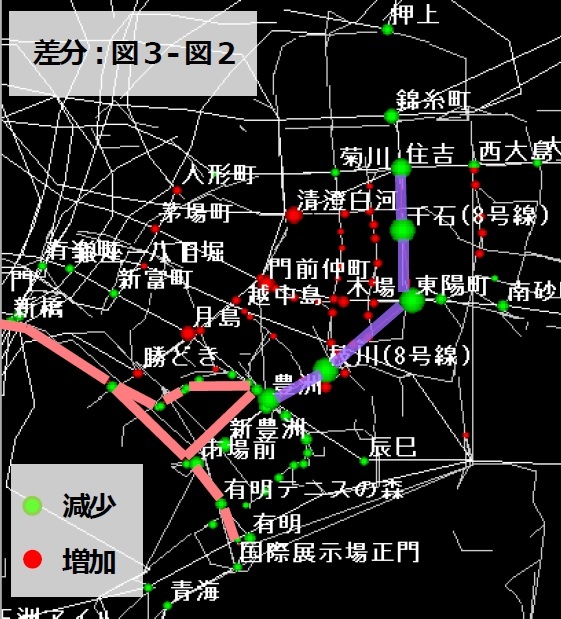 新交通システムの効果を次のように評価した.BRTと8号線建設前(図2)と建設後(図3)に対して,各バス停と駅(地図上の○)を通過する各便の利用度合の和を,○の色が青→赤(利用度合が小→大)として表現してある.変化を明示するために建設前と建設後の差分を図4に示す.緑が増加,赤が減少である.BRTの影響は沿線に沿って通過便利用度合が増加していてわかりやすい.8号線延伸の効果はそれよりも広い範囲にわたる.清澄白河,月島,門前仲町,木場の通過便利用度合がやや減少し,住吉,東陽町,豊洲の通過便利用度合が大きく増加している.また,住吉と豊洲に接続する路線上の通過便利用度合が増加して,その他の路線上(東西線と都営バス)の通過便利用度合が減少しているので,8号線延伸のねらいと一致していることがわかる.