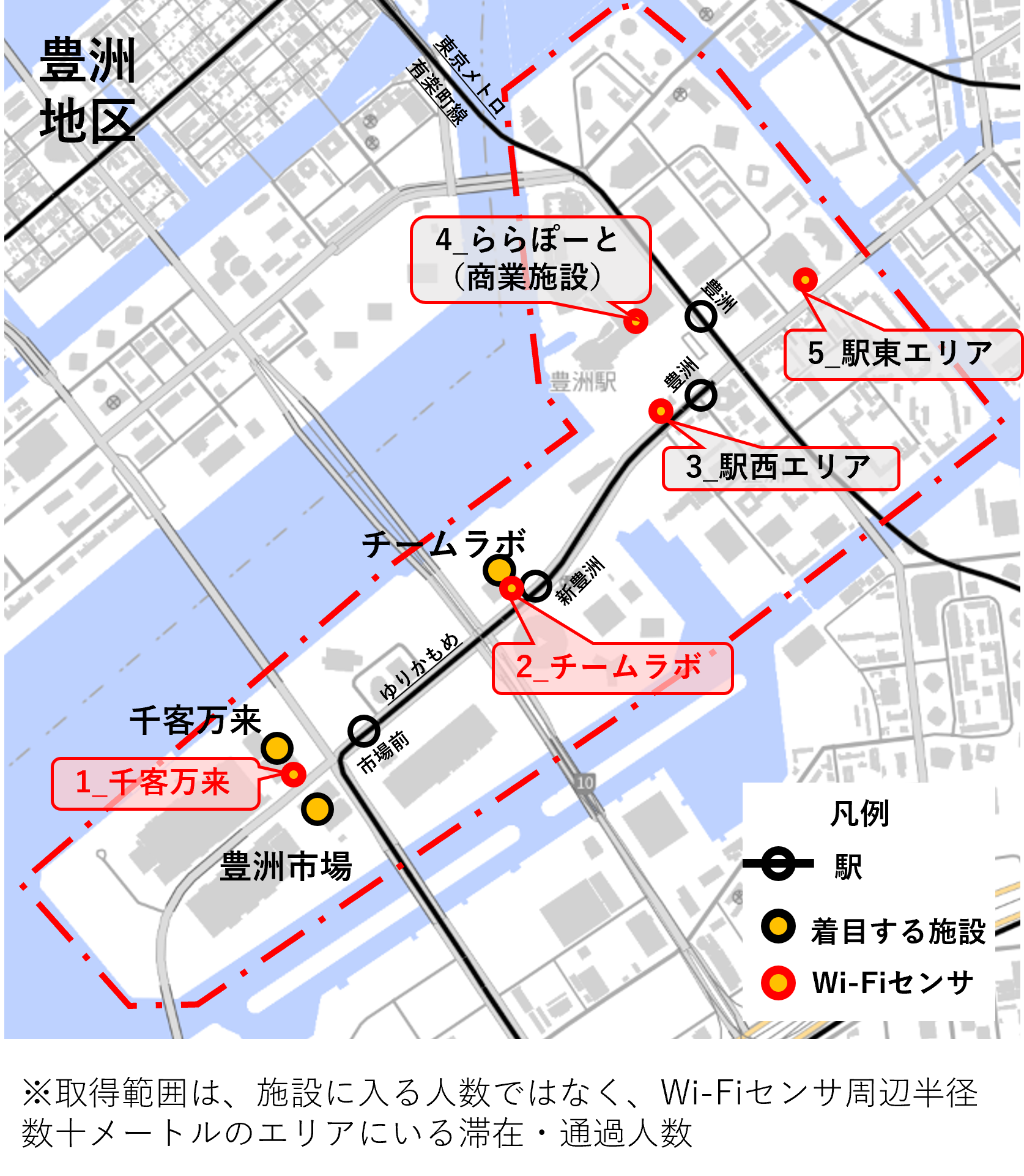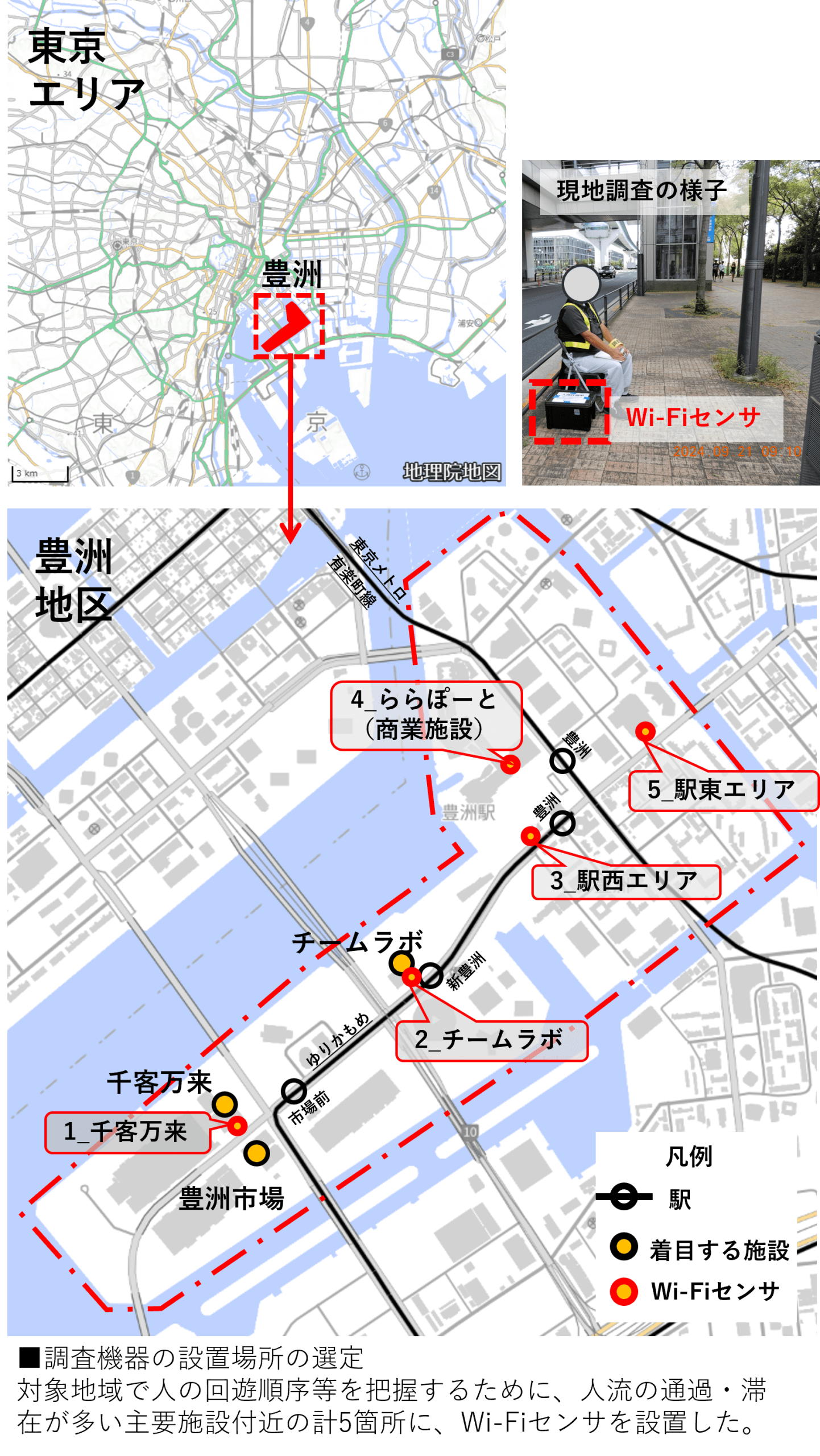 - 実施概要:街区レベルの移動・滞在状況を把握するために、豊洲地区を対象として、複数箇所にWi-Fiセンサを設置して人流調査を実施した。調査エリアのうち、集客力が強く重要な観光地となっている、千客万来とチームラボを主な分析対象とした。