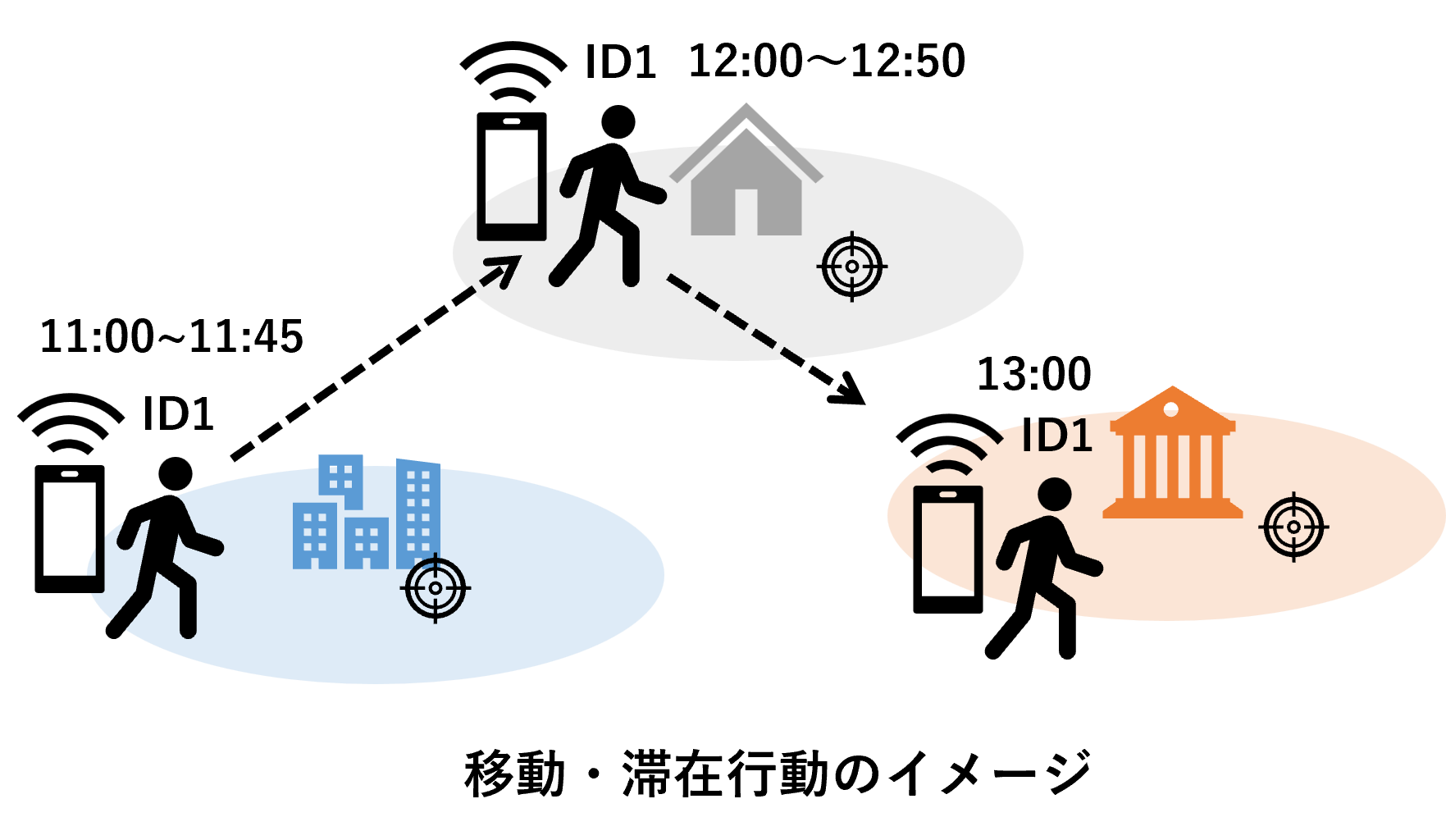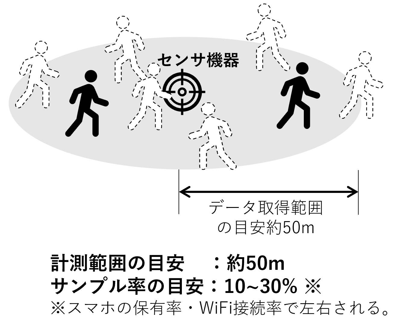道路上に配置したセンサ機器によって、歩行者のスマートフォンなどの端末(以下、計測対象端末)から発せられるWi-Fi信号を受信し、信号に含まれる端末識別情報(以下、SSID)より、信号を発信した計測対象端末がセンサ付近に存在することを検知する。SSIDを照合することにより、地域内での移動・滞在行動を分析する。