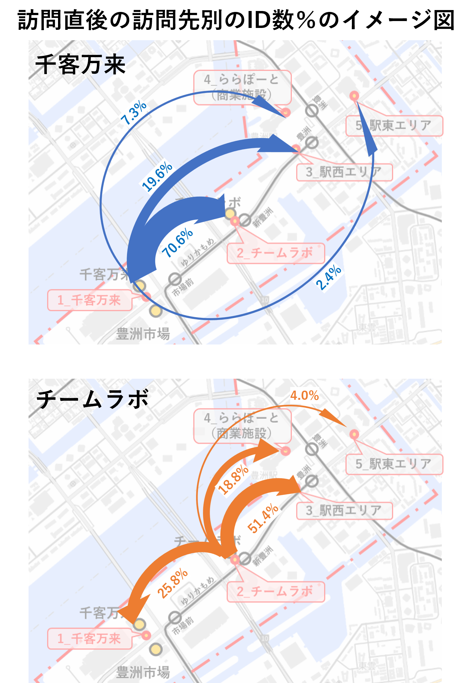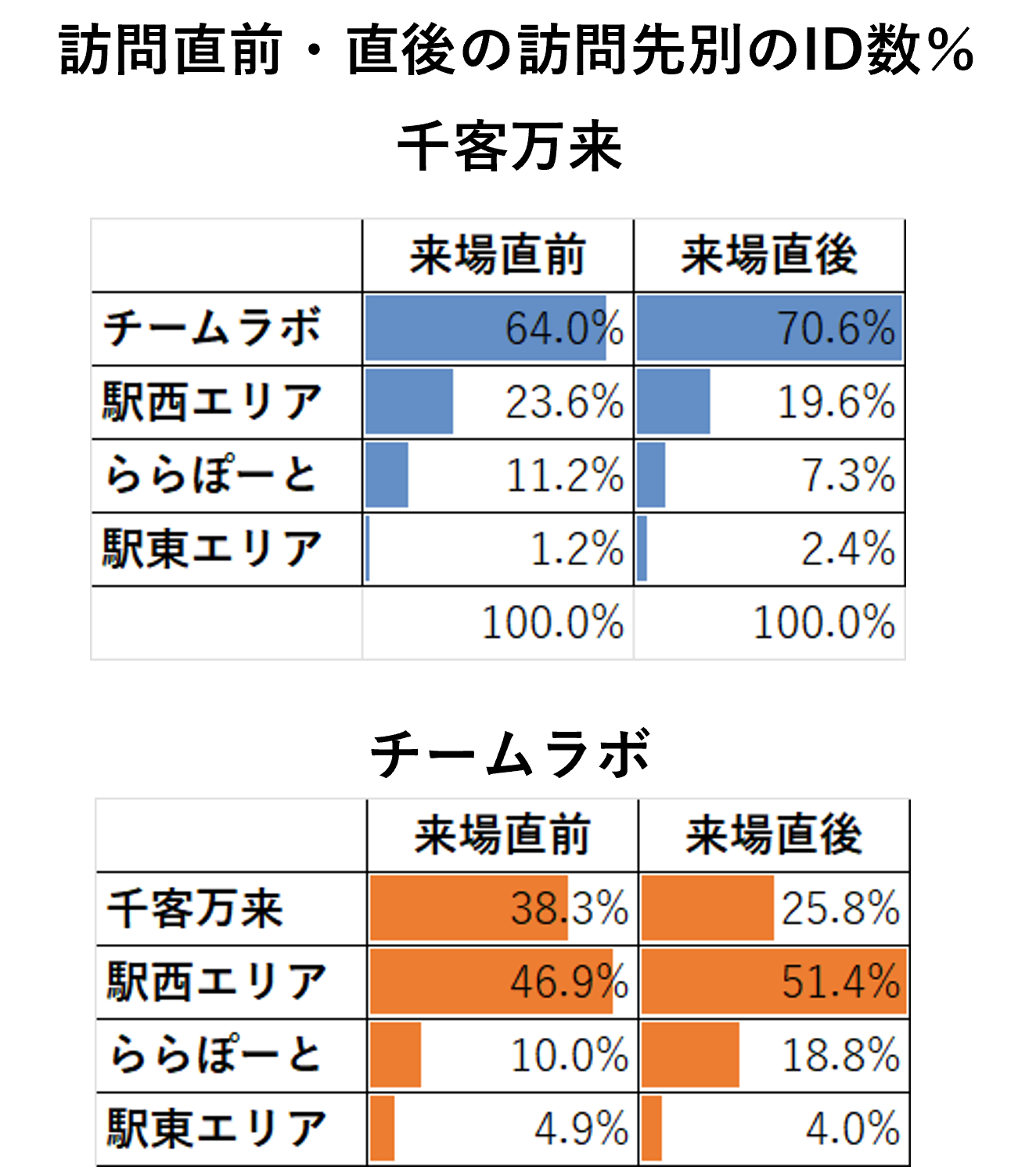 - 千客万来の訪問直前・直後に、チームラボ、駅西エリアを訪問したIDが多い